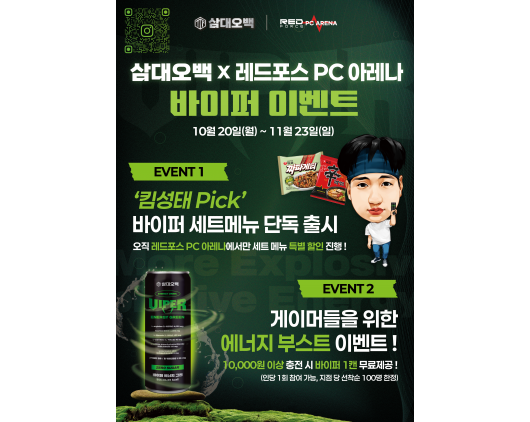 ‘레드포스 PC방 X 삼대오백 바이퍼’ 에너지 부스트 이벤트 50여개 매장 개시… 유튜버 킴성태도 합류